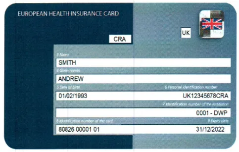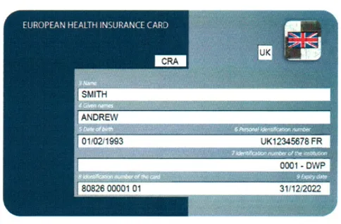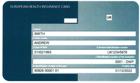 I det viste eksempel, er kortet udstedt til en britisk sikret, der studerer i Frankrig.