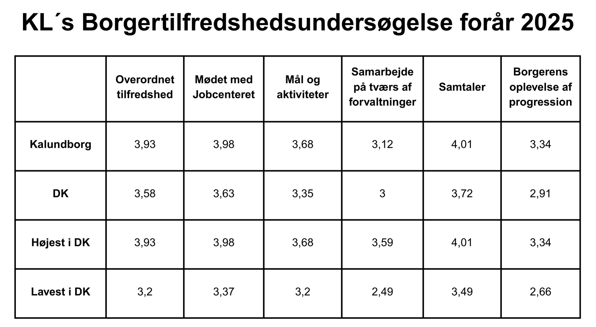 Kommunernes Landsforening har i samarbejde med Kalundborg og 42 andre kommuner gennemført en borgerundersøgelse på beskæftigelsesområdet. Den viser, at en stor del af borgerne i Kalundborg Kommune er glade for deres lokale jobcenter - faktisk så tilfredse, at resultaterne på en række områder ligger væsentligt over landsresultatet, og på fem ud af seks områder har borgerne den højeste tilfredshed i Danmark.