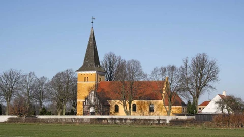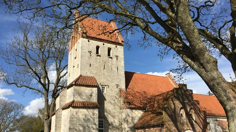 Magleby ligger lavt i en gammel flodbund med den markante kirke som vartegn.